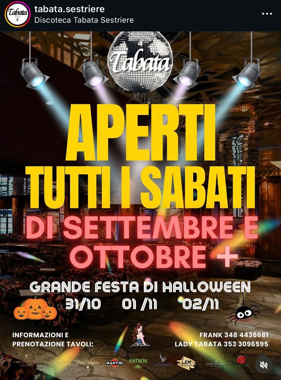 Tabata SummerInaugurazione stagione estiva Sabato 1 Giugno 2024 COSA C’È AL TABATA STASERA? TABATA Summer 2024 Grande Inaugurazione Sabato 1 Giugno Tutti i Sabati d’Estate Info e prenotazione tavoli ★Frank +39 348 4436681 ★ Lady Tabata +39 353 3096595 ★ whatsapp +39 392 5470391 LADY T al Tabata Sestriere